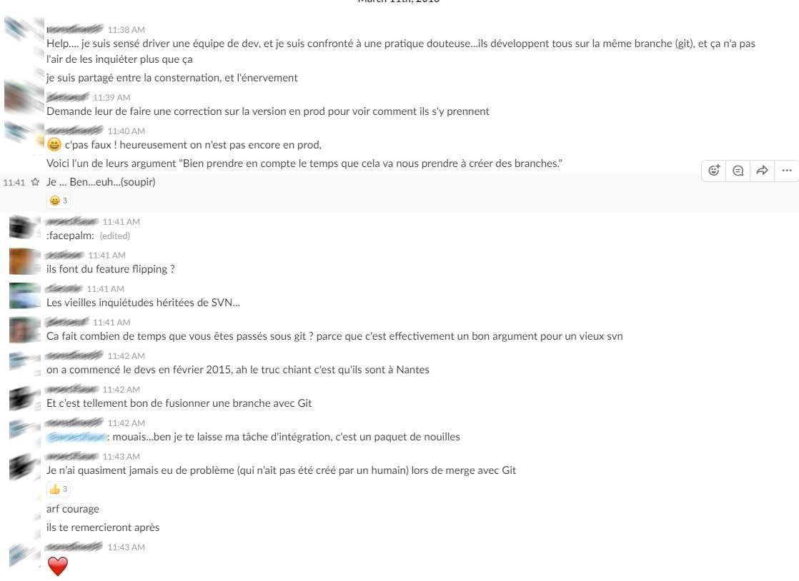 Pour l'anecdote en trainant sur un slack tech une fois j'avais assisté à une conversation où je n'ai pas souhaité participer et qui démontait cette pratique. Alors évidemment je ne doute pas que cette stratégie ne fera pas l'unanimité et ce billet n'a pas vocation à vous convaincre. Cette stratégie marche pour nous, c'est tout ce que je peux en dire. Et il y a sans doute des équipes pour qui le Feature Branching marche très bien.