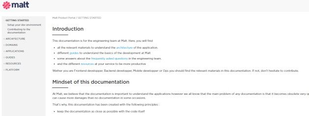- Architecture : une liste de docs qui explique les grands principes de l'architecture chez Malt, les choix techniques effectuées et comment ils ont été pris (avec les compromis acceptés)