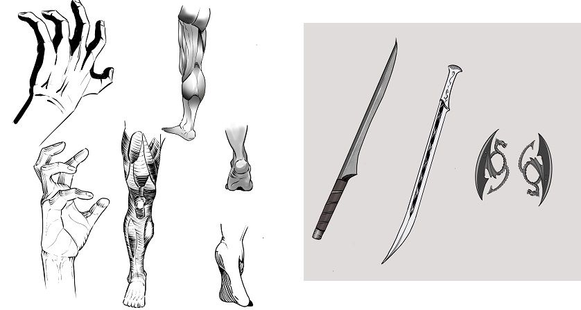 En dessin il y a une pratique qui doit être presque journalière, il s'agit des études/study. On identifie un sujet qu'on veut travailler en particulier, ca peut être un objet (une épée par exemple) ou une partie du corps humain (les mains….). On cherche des références et on noircit des feuilles.