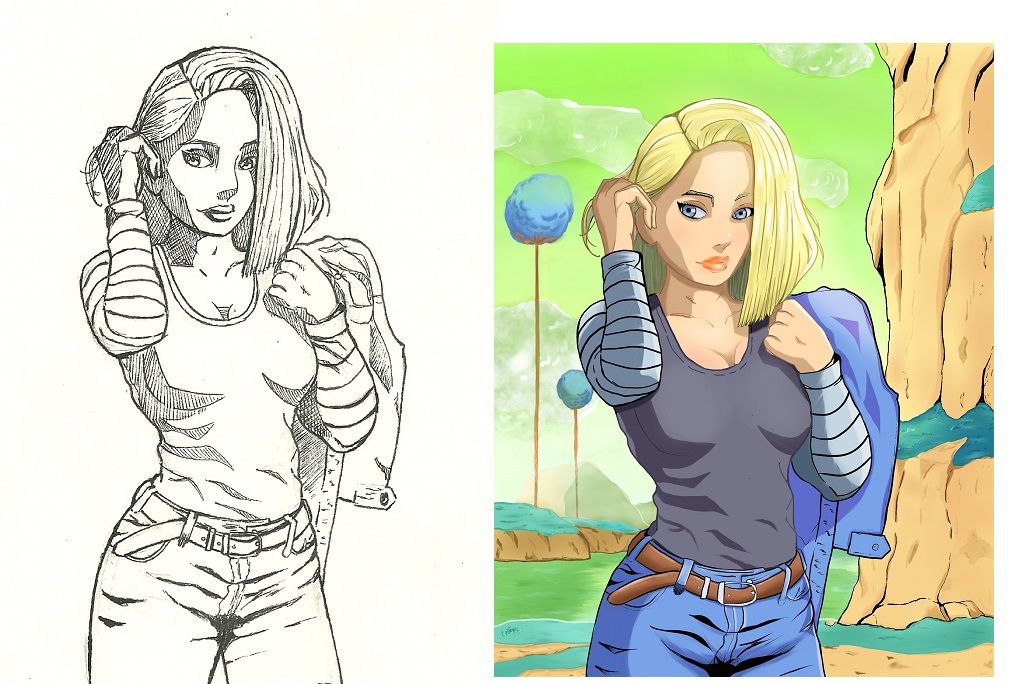C-18 de la série Dragon Ball, avec l'encrage initial puis le dessin repris sur tablette avec un background. Ca illustre justement que c'est pas du tout mon point fort cette dernière étape :)