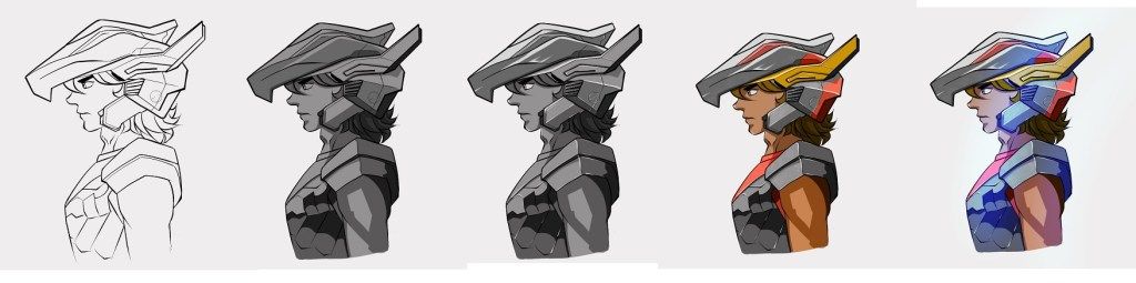 Illustration des étapes de mises en couleurs sur Seiya de la série Saint Seiya et d'ailleurs cette fois en utilisant des valeurs