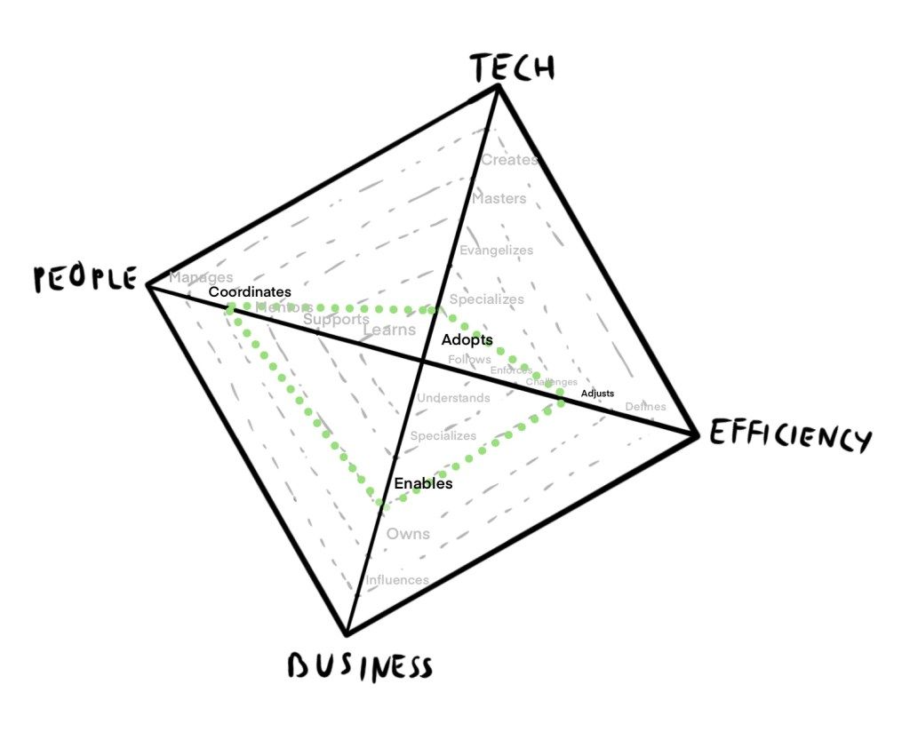 C’est pourquoi nous avions également des “leads” qui prenaient ce rôle de mentors et coachs. Ces leads pourraient être représentés comme suit dans leurs rôles de tous les jours :