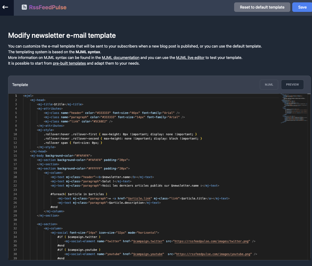 Le matin, j'avais donc publié un article sur la mise en place de MJML sur Hakanai. Et surtout, j'ai ajouté un éditeur de code permettant aux utilisateurs de modifier leur template.